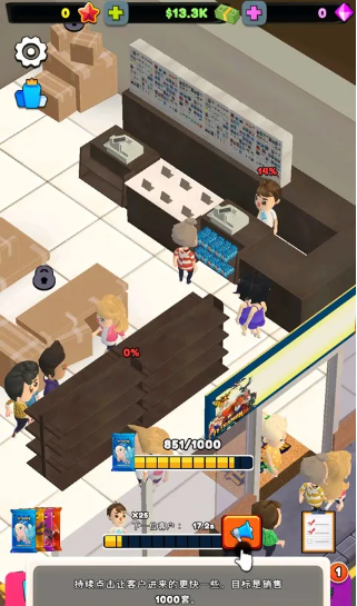 2、前期无需急于扩建店铺,额外购置2-3个货架即可。升级至10级后雇佣50单位/天的员工负责收银,自己专注手动补货;