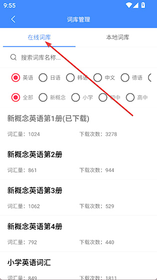 3、点击上方在线词库,然后选择词库下载使用