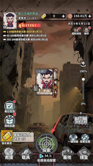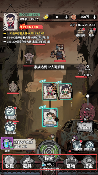 游戏底部设有【救援】【载具】等功能入口,需达到指定家族人数后逐步解锁。持续消耗电池推进探索,可不断提升战力,应对更强敌人。