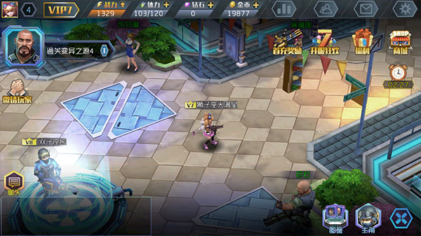 玩家可以在队伍界面中给人物角色更换对应等级的装备,装备可以通过过图、副本抽奖获取。每个帐号可以控制三个角色,分别为突击手、散弹手、狙击手;散弹手激活条件为80级或者为VIP4,狙击手激活条件4觉或者VIP7;每个角色都有一套自己的装备,详情里面可以查看人物属性