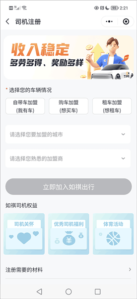 3、然后在这里填上你的加盟城市和加盟商后选择并点击“立即加入如祺出行”的选项;