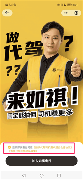 4、在代驾界面只需要点亮红色方框内的选项后选择并点击“加入如祺出行”的选项;