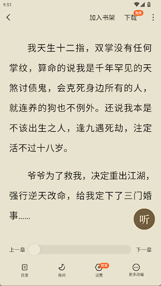 支持文字阅读、后台听书、自动滚屏及夜间护眼模式,适配不同光线环境与使用习惯。
