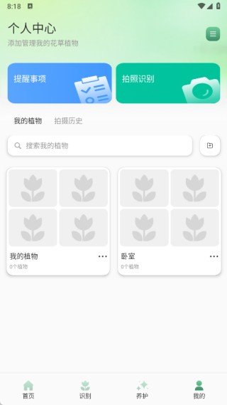 4、在我的页面查看提醒、识别记录,管理已添加的植物及卧室植物信息。