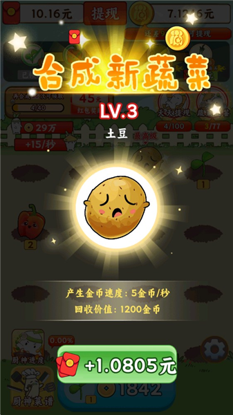 3、收益产出:蔬菜生成后持续产出金币,等级越高,每秒产出金币越多;高阶蔬菜还可点击 “收获” 按钮一次性获取大额金币 / 特殊货币。