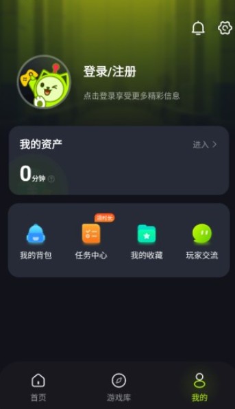 4、“我的”页面支持登录/注册,可查看资产、背包、任务中心等内容。