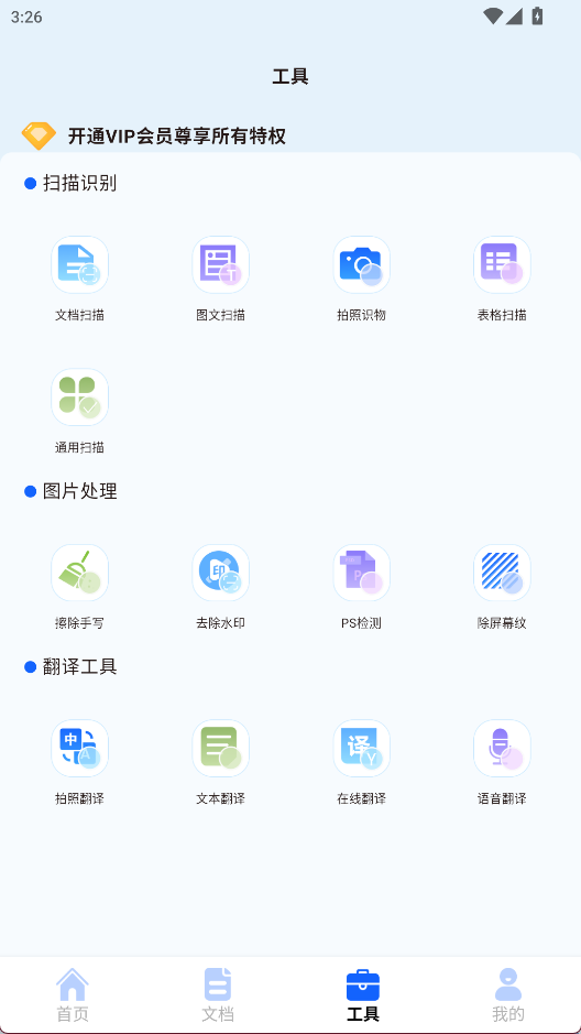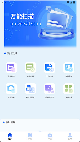 1、首页提供了多种热门工具,如图文扫描、表哥扫描等