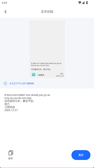 2、导入照片后自动提取文字,可以一键复制、保存