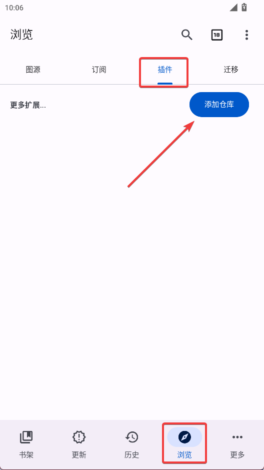 1、进入“浏览”界面,选择“插件”,点击“添加仓库”