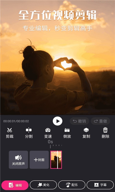 2、全能编辑:剪辑、旋转、加字幕、配乐一步到位高效完成。