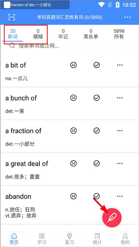 1、打开悬浮记单词 APP 完成登录,进入首页后在新词、模糊板块,点击单词右侧写字图标可默写单词。