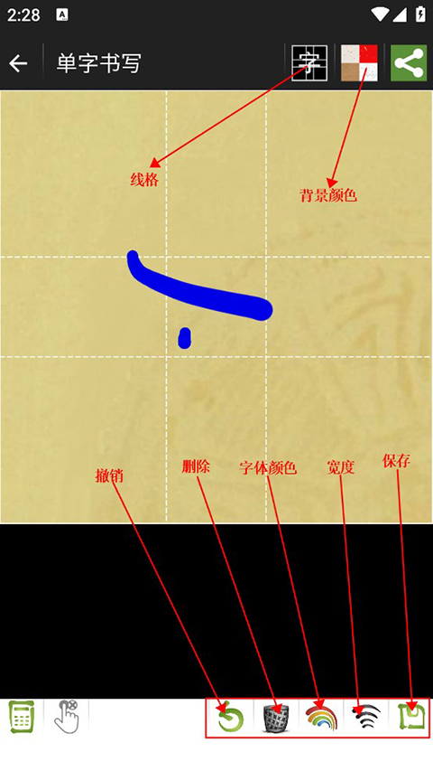 4、练习界面右下侧功能从左到右为撤销、删除等五项功能,右上侧是虚线框和背景图设置。