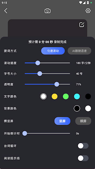 支持调节字体大小、颜色、背景透明度及提词区域位置,用户可根据设备摆放距离和拍摄角度灵活设置,提升阅读舒适度。