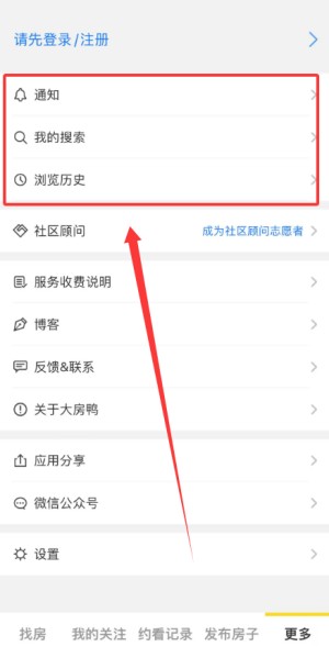 4、点击更多功能板块,可查看系统通知、管理历史搜索词及查阅房源浏览记录。