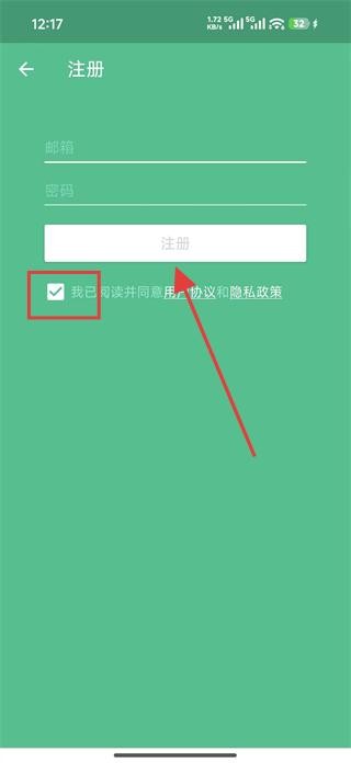 2、注册界面输入邮箱与密码,勾选同意协议及隐私政策,点击注册即可完成并进入主界面。