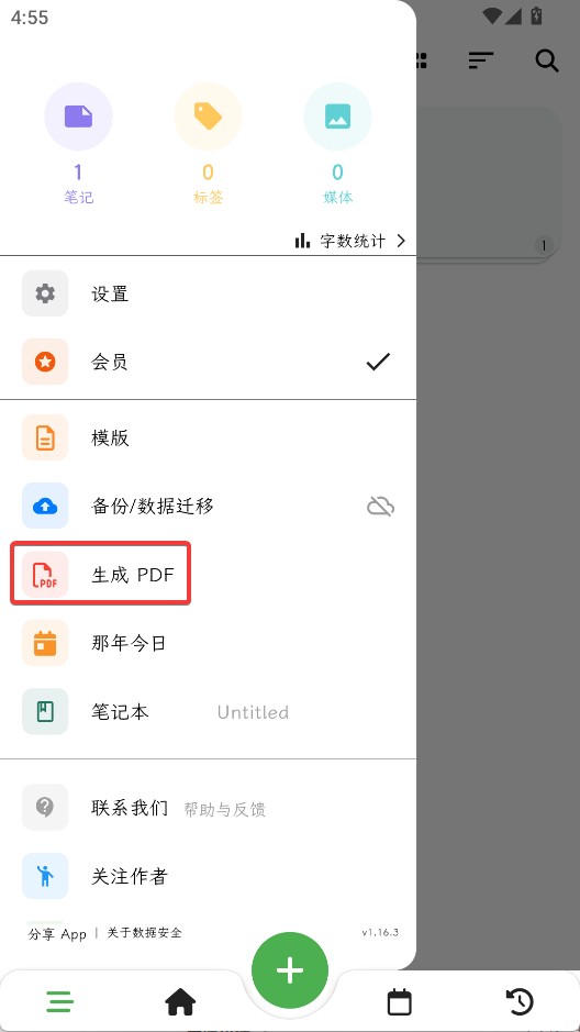 2、在侧边栏选项中找到并点击“生成PDF”,进入导出设置界面。