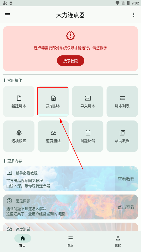 1、首先下载安装大力连点器软件,然后用微信、QQ或者手机号进行登录,来到软件首页,授予权限。
