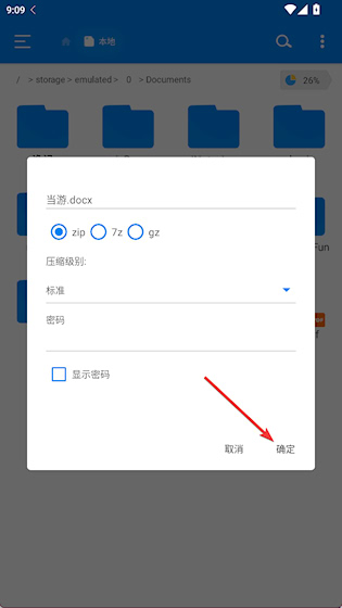 4、选择压缩格式和等级,点击确定