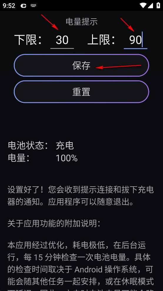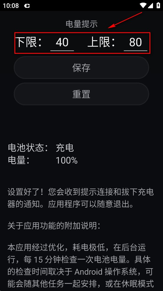 2、充电至高于最高值会提醒停止充电,电量低于最低值时触发充电提醒。