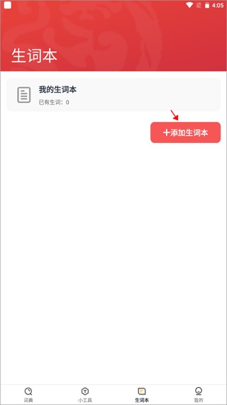 1、切换至“生词本”页面,点击右上方“添加生词本”按钮;