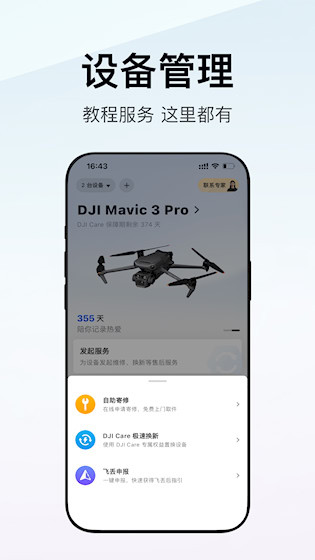 涵盖DJI Care服务查询与售后支持,为设备使用提供多维度安心守护。