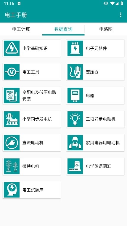 1、运行APP后,可在电工计算、数据查询、电路图三大版块选择所需功能。