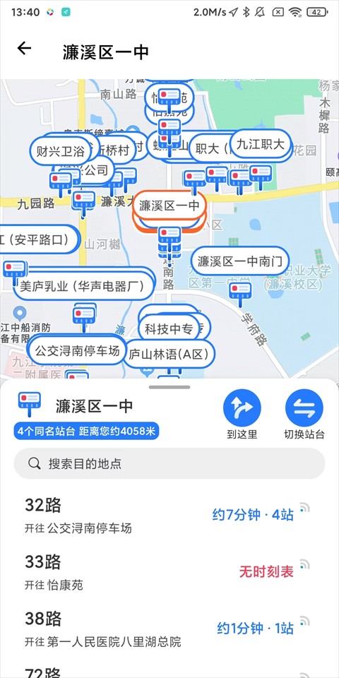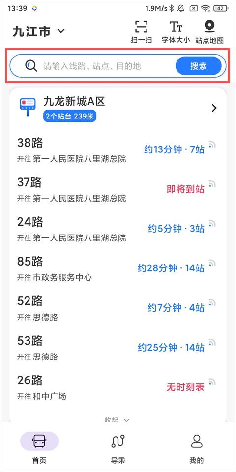 1、打开易公交APP,自动定位所在城市,点击上方搜索栏查询路线、站点或目的地;