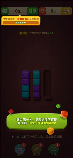 1、进入游戏当中,完成关卡的进度就能获得红包奖励,