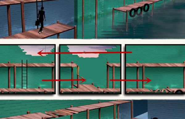 到了第四章后,玩家可以感觉到比之前明显轻松很多了,只需摆放好位置就可以了。有两部分,一开始是久违的简单关卡,调换一下下面画面的位置就可以了,还有就是高楼追逐,也是涉及需要多次调整,稍微复杂一点