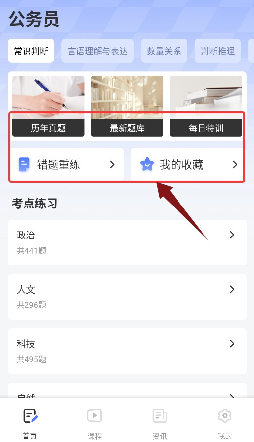 2、首页整合历年真题、最新题库、每日特训、错题重练等核心备考功能,一目了然;