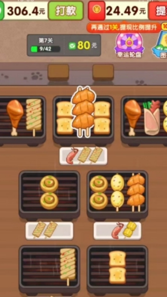 3、关卡难度会随着玩家的闯关进程逐步提升,面对难度升级的挑战,只需保持快速的操作反应,精准完成烤串的匹配放置,就能顺利达成消除目标、完成对应关卡。