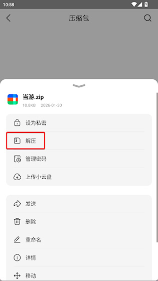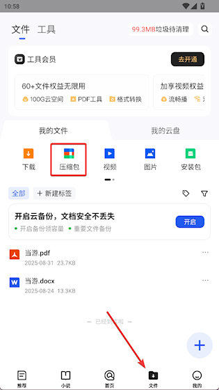 1、点击底部导航栏里的文件,然后选择压缩包功能