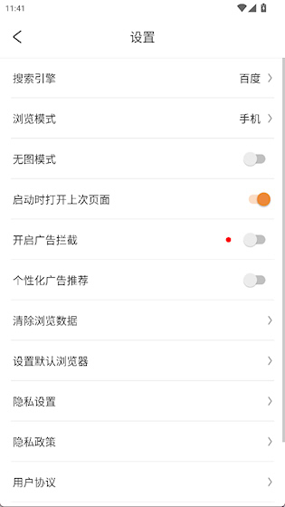 3、进入设置界面,可以更改搜索引擎、切换浏览模式
