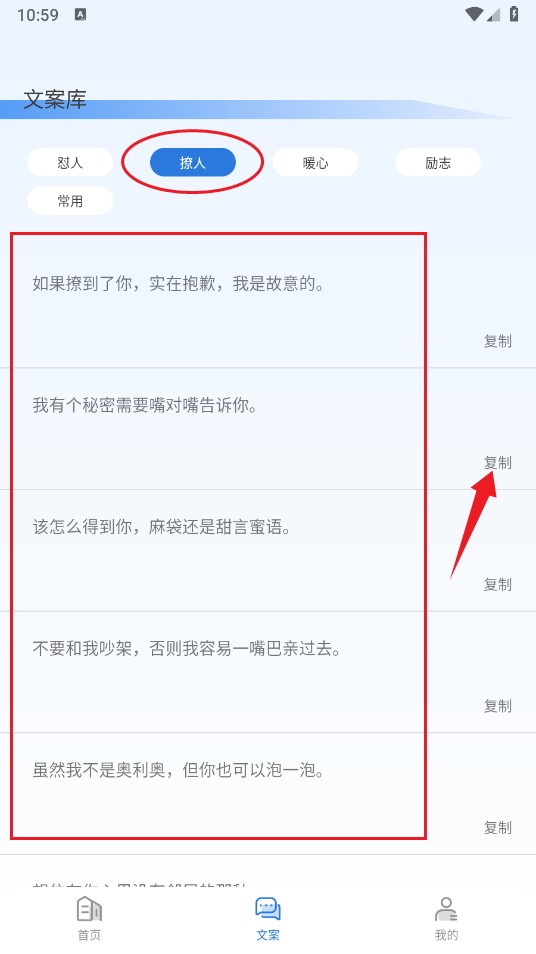 5、进入软件文案库,里面提供撩人、暖心、励志等各类文案,可挑选感兴趣的类型查看,点击右侧复制按钮即可使用。