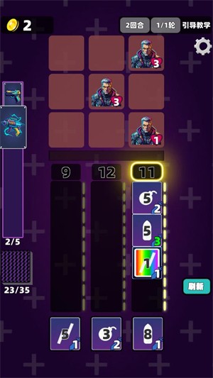 4、进入战斗环节,需将数字卡片放入对应卡槽,卡牌数字之和匹配卡槽数字即可攻击对应列敌人;