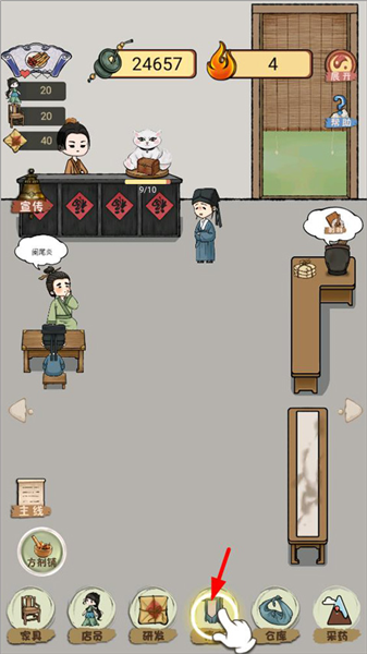 1、打开游戏,进入方剂铺,可以看到济时再给病人看病,点击集市去看看有没有可购买的;