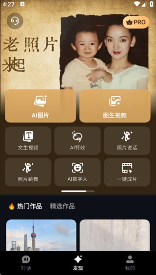 1、打开美趣 AI App,在「发现」板块挑选所需服务,平台涵盖文字生成视频、AI 特效、照片说话等功能。
