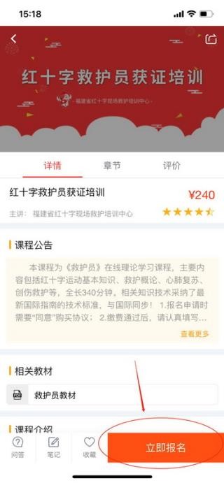 2、进入获证培训页面后,点击底部的“立即报名”按钮,开启报名流程。