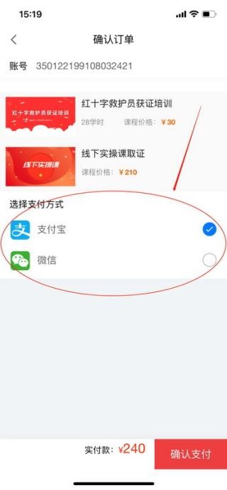 6、支付方式选择“支付宝”或“微信”,点击“确认支付”,完成课程费用支付即可。