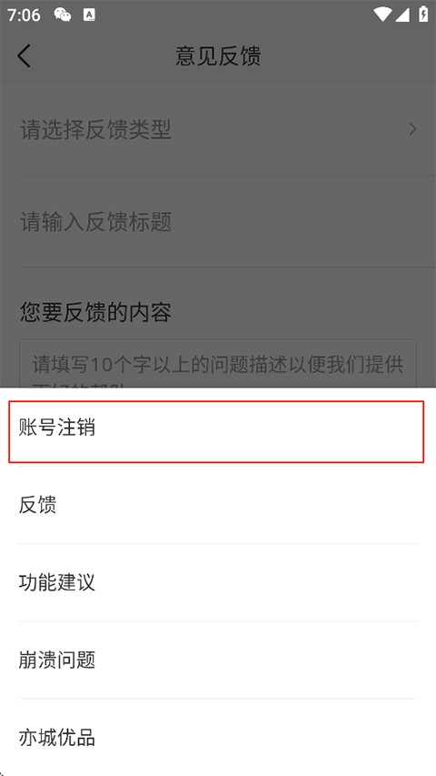3、在反馈类型选项中,选中“账号注销”,填写相关注销说明及所需信息。