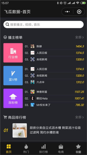 1、飞瓜数据默认打开首页,可以看到当日的行业排行榜、蓝V排行榜,以及涨粉排行榜。