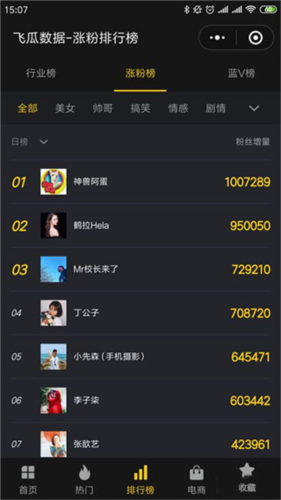 2、点击【涨粉榜】后,默认查看当日的粉丝增量排行榜。