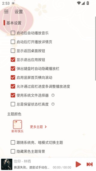 4、进入设置页面,可完成基础设置,涵盖主题颜色、歌词字体颜色大小等。