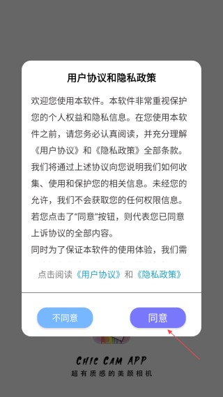 1、打开百变特效相机免费版app,仔细阅读并同意软件的用户协议与隐私政策。