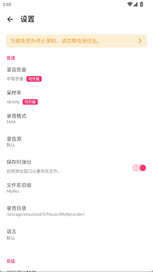 3、设置界面提供录制质量、采样率、录音格式等多种设置