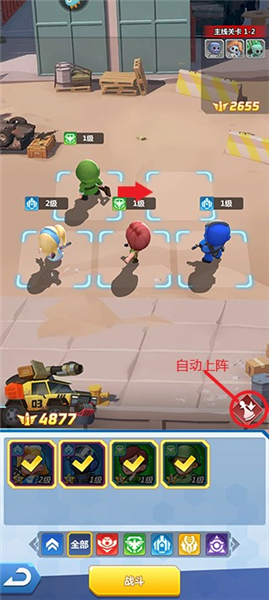 3、在开始战斗前需要调整阵型,可以点击右下方自动上阵也可以自己点击卡牌进行调节。