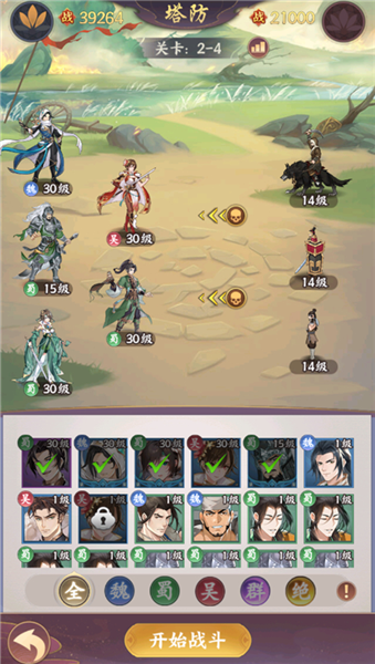 4、选择闯关并点击它,搭配我们的阵容,可拖动角色放置,