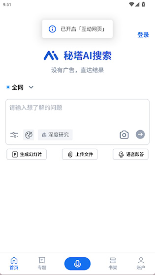 1、首页有互动网页、深度研究两种模式