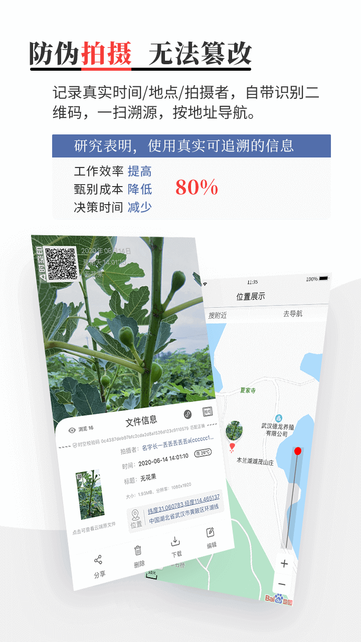 1、拍摄时自动记录真实时间、地点与拍摄者相关信息。
