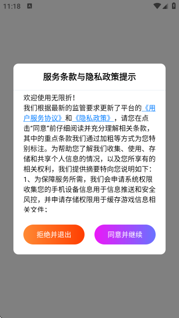 1、首次打开APP,会弹出服务条款与隐私政策提示,阅读后点击同意并继续进入。